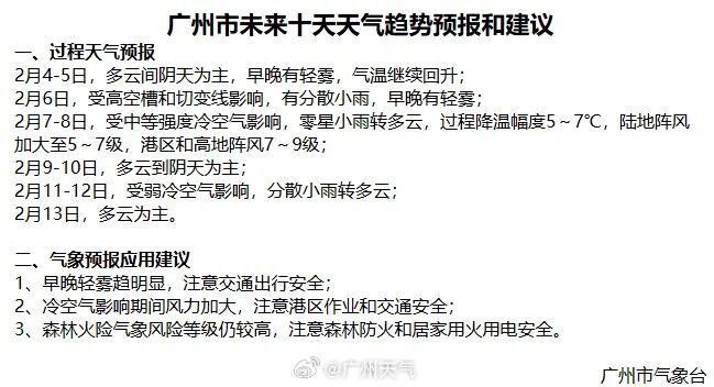 广州市气象台预计,2月5日—6日广州云量较多,早晚有轻雾,其中2月6日有分散小雨。2月6日夜间—8日受中等强度冷空气影响,广州零星小雨转多云,冷空气影响过程降温幅度5~7℃,陆地阵风加大至5~7级,港区和高地阵风7~9级。2月7日广州最高气温将降到“1字头”。